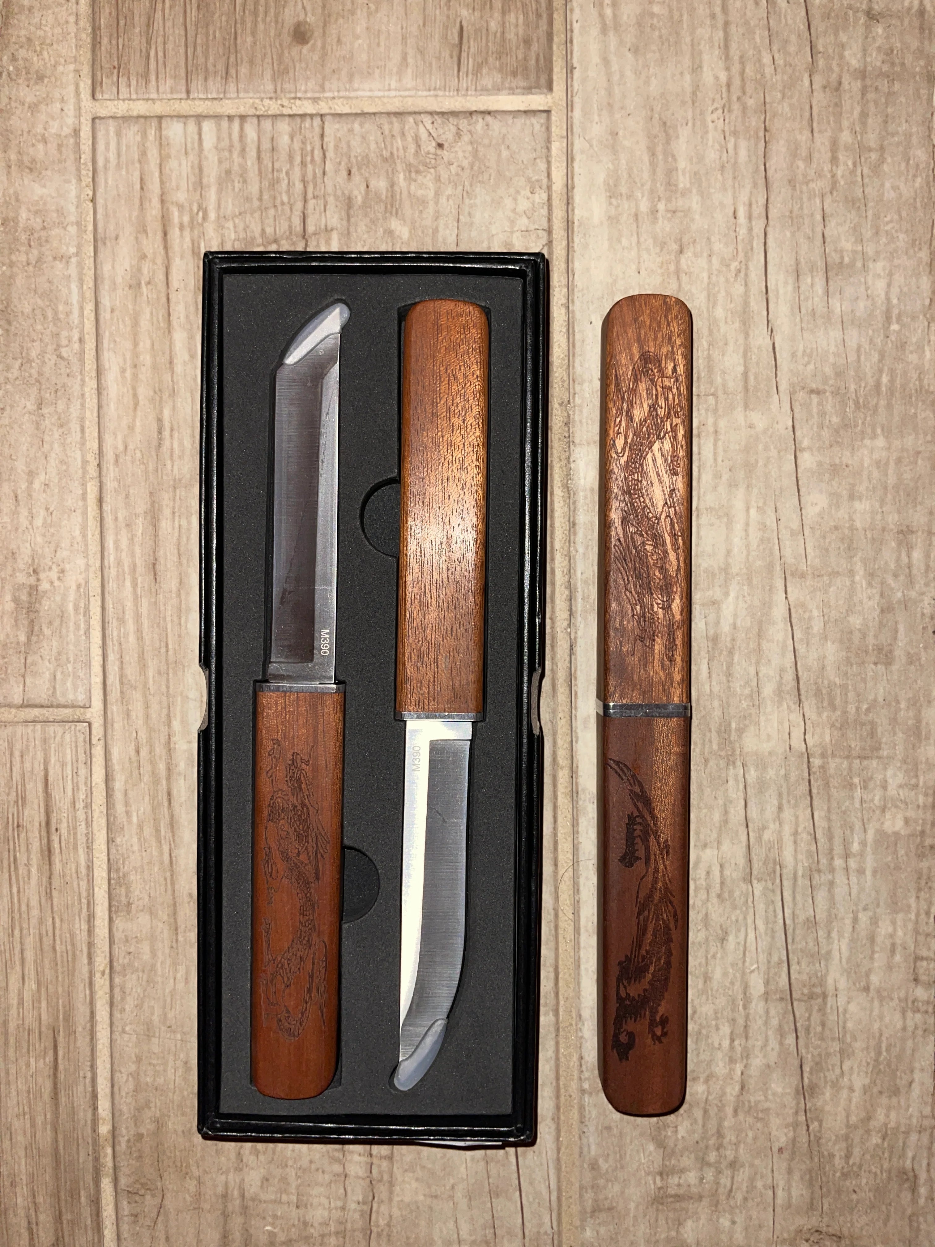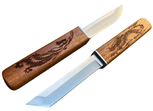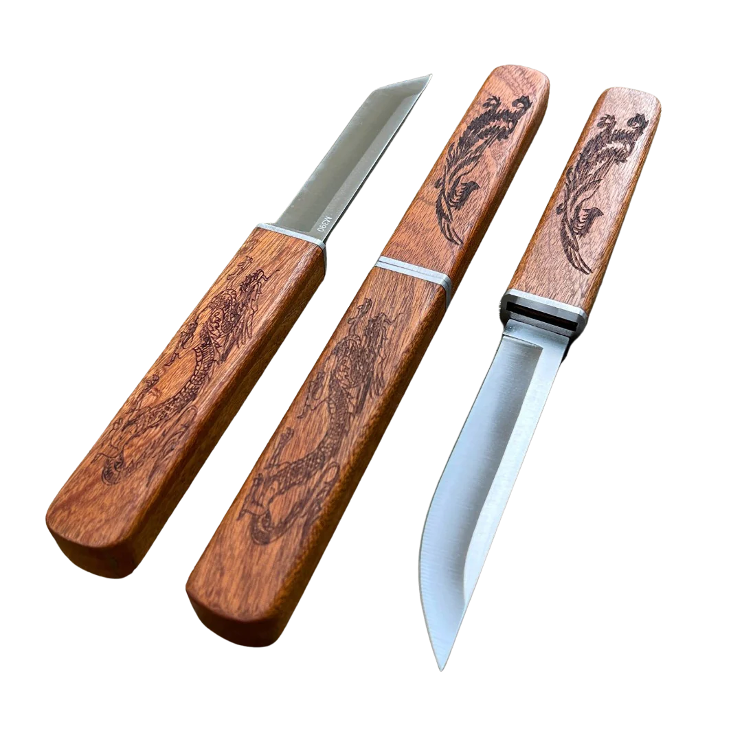 Reminiscent of traditional samurai swords stored in wooden scabbards, this unique piece embodies a rich heritage. Equipped with a razor-sharp 4.5-inch chef and kiritsuke knife, this compact collector's item is ready for food preparation both in the kitchen and the great outdoors